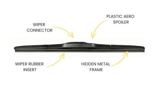The Hybrid blade is made up of a hidden or enclosed metal frame like traditional wipers with an aerodynamic plastic cover on top which helps to improve performance. They are called Hybrid wiper blades as they are traditional blades that have basically been updated with an aerodynamic spoiler to improve performance and design.